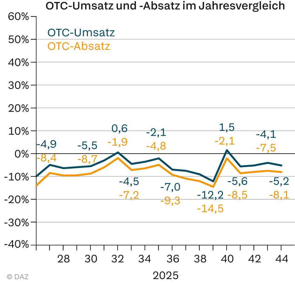 Der Rückgang war damit nicht ganz so groß wie im September, aber die Entwicklung war weiterhin schwächer als im bisherigen Gesamtverlauf des Jahres. Denn der kumulierte OTC-Absatz war bis zum Ende der 44. Woche 3,9 Prozent niedriger als 2024.