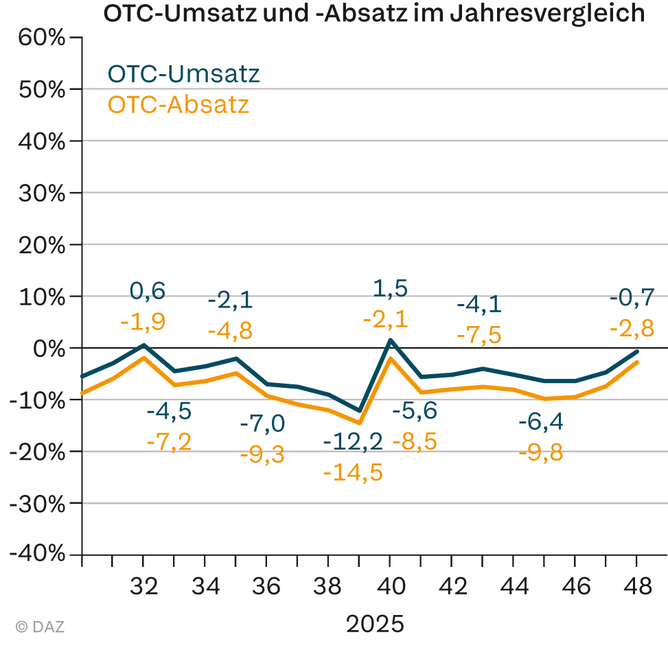 Im OTC-Bereich hat sich der bestehende negative Trend im November fortgesetzt. In allen vier Novemberwochen waren der OTC-Absatz und der OTC-Umsatz jeweils niedriger als im Vorjahr. In den ersten drei Novemberwochen war der OTC-Absatz zwischen 7,4 und 9,8 Prozent niedriger als 2024 – mit den schwächsten Werten am Monatsbeginn. In der vierten Novemberwoche war der OTC-Absatz 2,8 Prozent geringer als 2024 (siehe Abbildung). Der kumulierte OTC-Absatz bis zum Ende der 48. Woche war 4,2 Prozent niedriger als 2024. Der OTC-Umsatz der Vor-Ort-Apotheken war in den ersten drei Novemberwochen 4,7 bis 6,4 Prozent niedriger als 2024 und in der vierten Monatswoche „nur“ 0,7 Prozent niedriger als 2024. Der kumulierte OTC-Umsatz bis zum Ende der 48. Woche lag 1,3 Prozent unter dem Vorjahreswert. Der Abstand zum OTC-Absatz lässt sich durch Preiserhöhungen erklären.